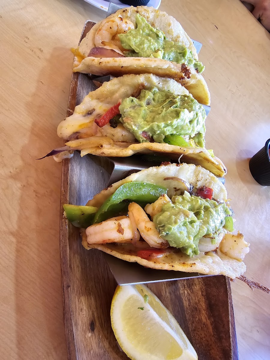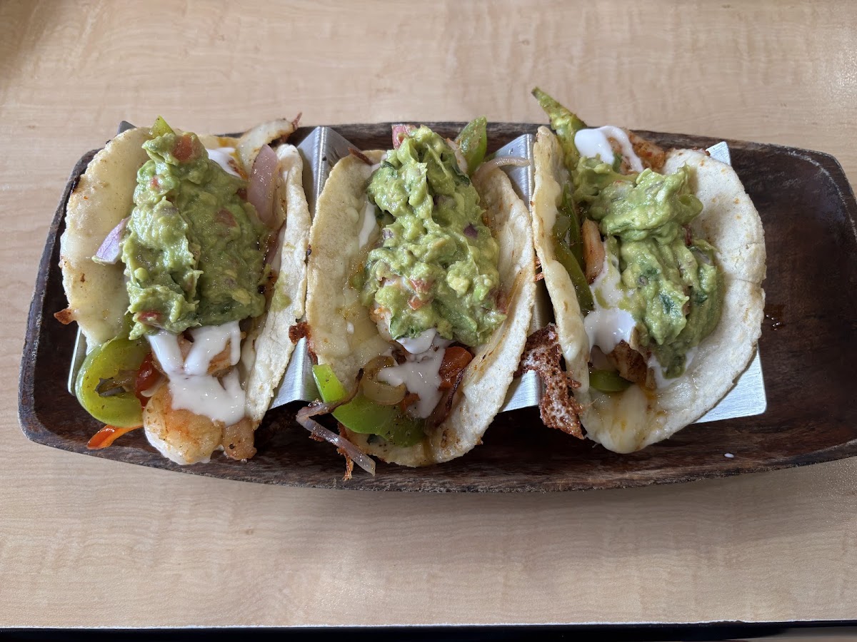 3 shrimp Tacos were excellent. Ample guacamole, sour cream, sautéed onions and peppers. Presentation of wood bowl was great. The salsa was Hot with the chips. I liked the atmosphere. Service was professional. I will be back!